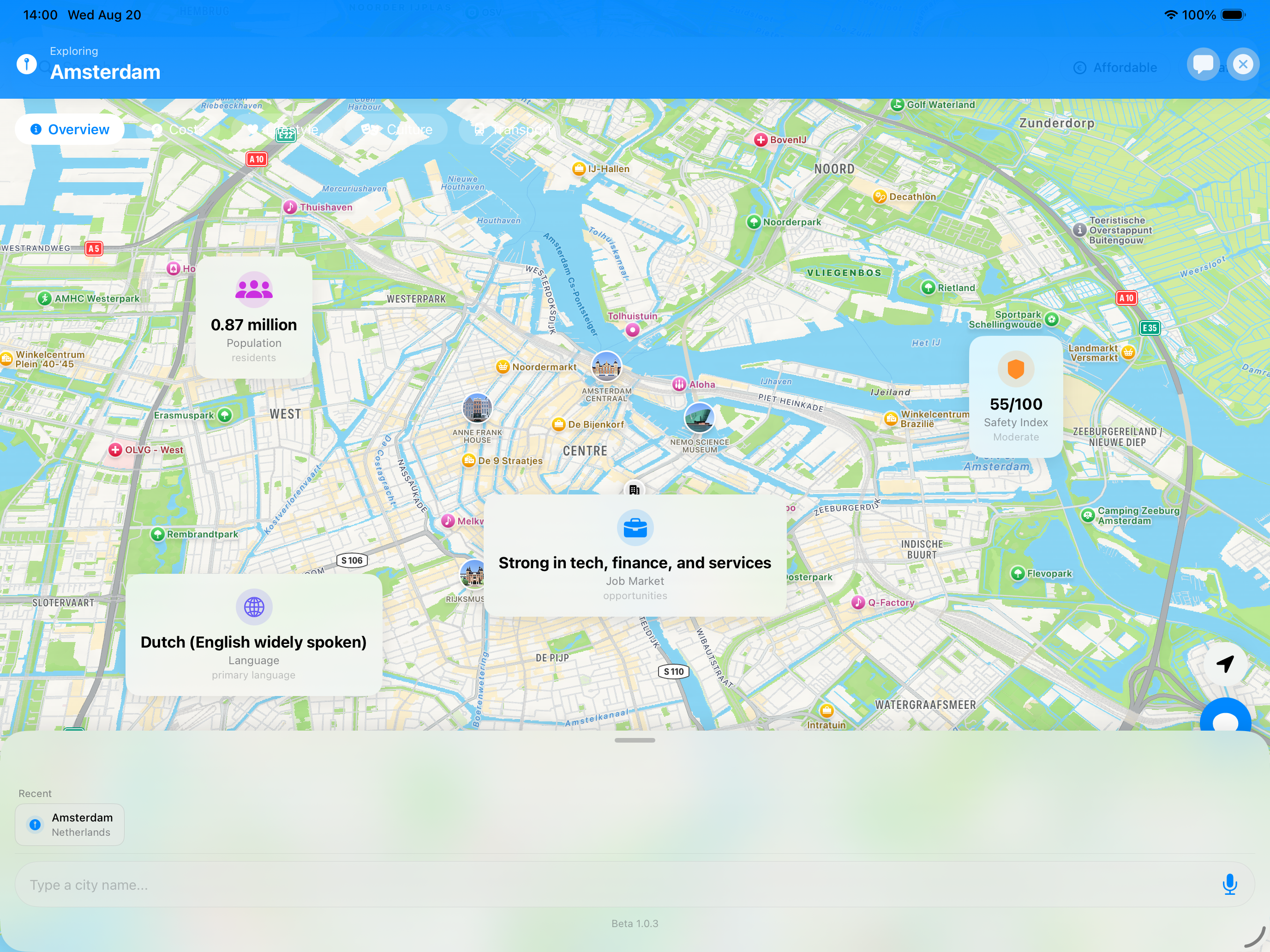 With information about the population, safety, primary spoken languages, job market, cultural interest and unique city features and more highlighted on the map.