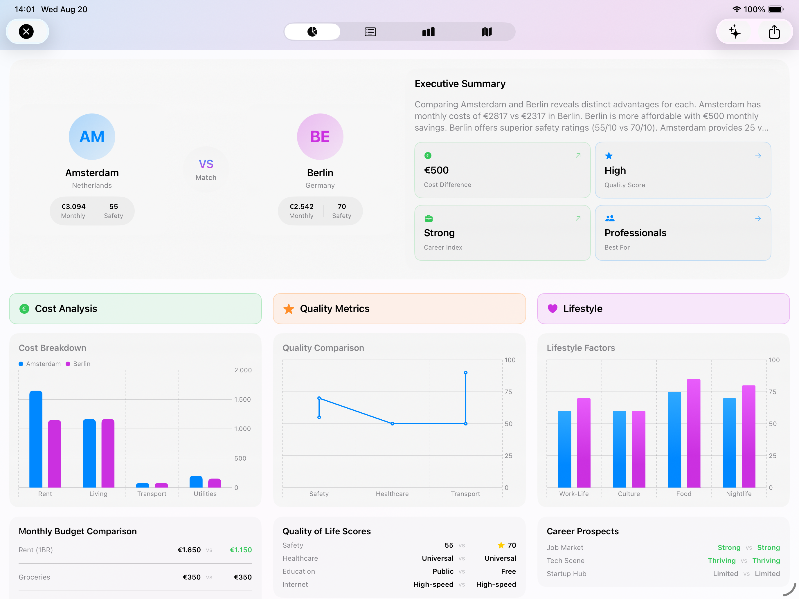 • Transportation:Evaluate the cost, availability, and efficiency of public transit in each city. From monthly metro passes to regional train networks, mEUvy helps you understand both expenses and commute quality.
