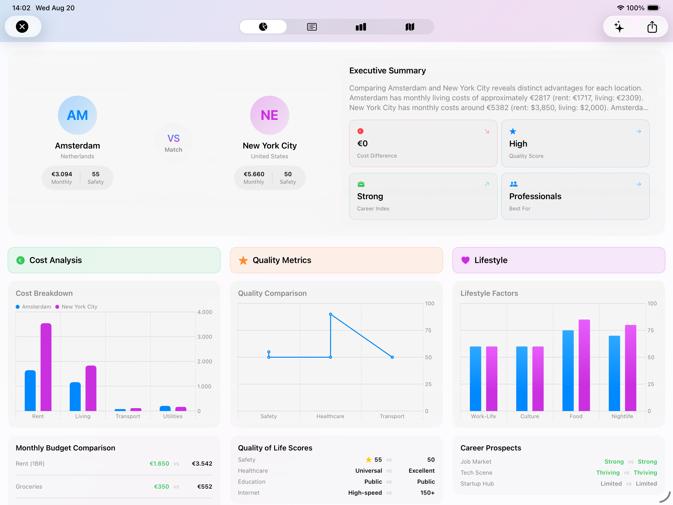 • Cost of Living: Compare everyday essentials like groceries and cinema tickets across cities to gauge lifestyle affordability. Explore dining out, fitness memberships, and cultural activities to understand the true cost of living.